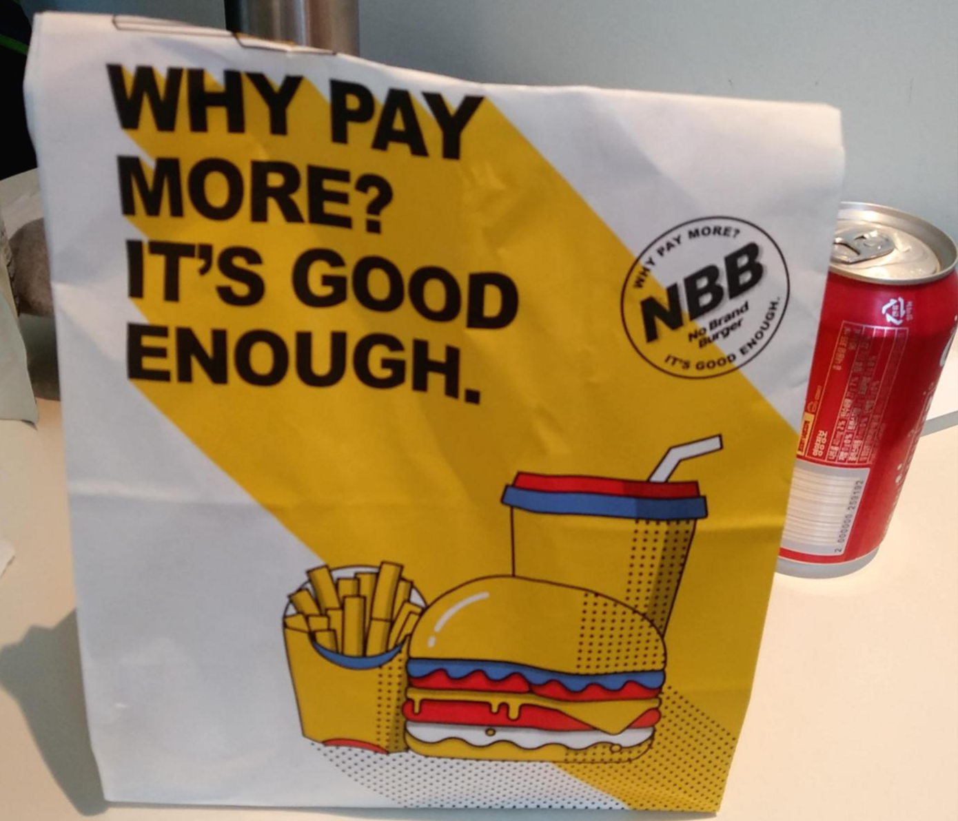 오리지널 버거, 감자튀김, 노브랜드 콜라입니다. 음료는 일부로 깡통으로 주문했습니다. 운반하기 편하게요.