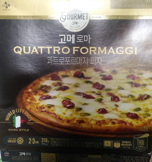 오늘도 냉동피자 후기를 올려보겠습니다. 이번 제품은 제일제당사의 고메 로마 콰트로포르마지 냉동 피자입니다.