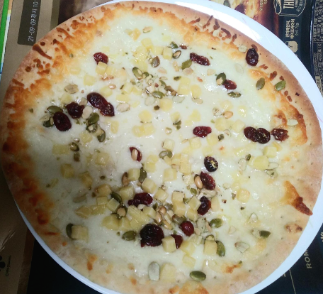 이 피자의 특징은, 콰트로에서 나오듯이, 여러 가지의 치즈가 들어갑니다. 사진에서는 그림자 져서 확실히 안보이는데, 모짜렐라 16.8%, 고다 11%, 까망베르 0.2%, 고르곤졸라 0.1%, 체다 3.7%, 크림치즈 1.5% 가 있다고 합니다. 콰트로 해서 4가지인 줄 알았는데, 6가지가 들어가네요. 실제로 가열을 해서 꺼낼 때의 확 풍기는 치즈 냄새는 상당히 좋았습니다.