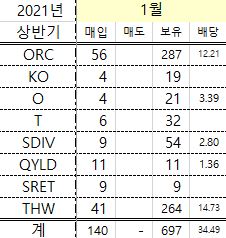 1월에는 140주를 매수하고 매도는 없습니다. 매수의 대부분은 Orchird와 Tekla Health네요. 배당도 마찬가지고요. 이 두회사가 높은 배당만큼이나 높은 위험도를 가지고 있습니다만, 배당 때문에라도 한동안은 가지고 가려고 합니다.