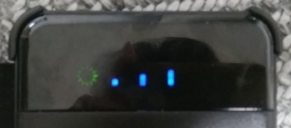 왼쪽에 해 모양으로 충전중이라고 표시가 되고 오른쪽에 충전량이 표시가 됩니다. 충전량은 4개의 막대로 표시가 됩니다. 이 제품의 단점이 충전과 충전량의 표시 뱕기가 약해서 환한 곳에서는 잘 안 보입니다.