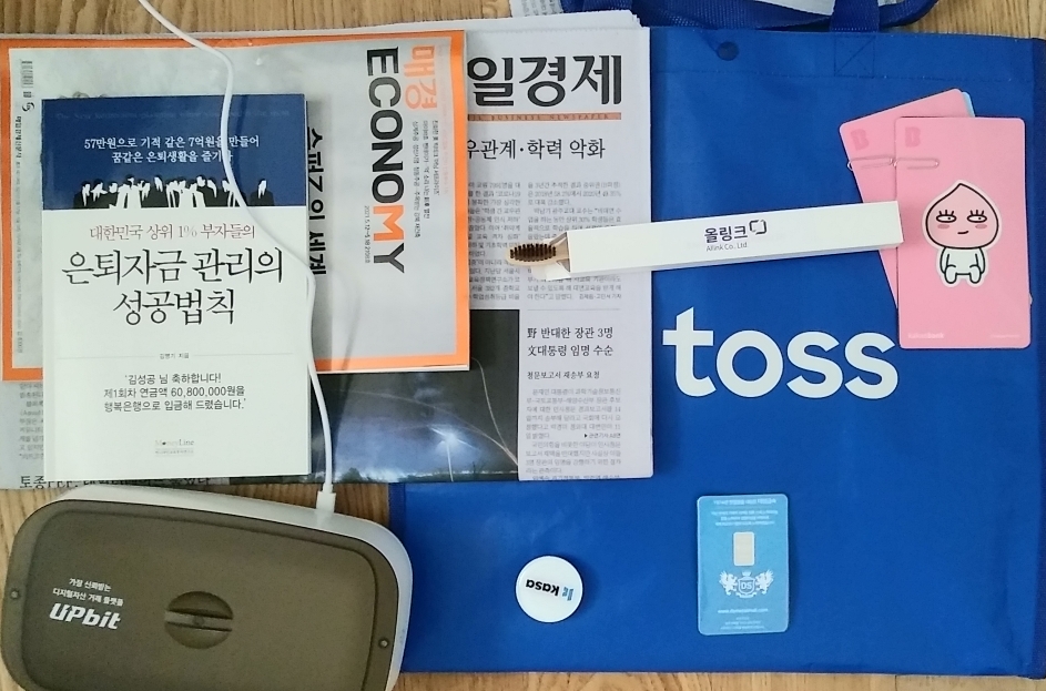 마지막으로 선물 받은 겁니다. 대창금속에서 은괴 토스에서 가방 업비트에서 살균기 매경에서 잡지 카사에서 스마트폰 부착물 올링크에서 칫솔 그리고 책를 받았습니다.