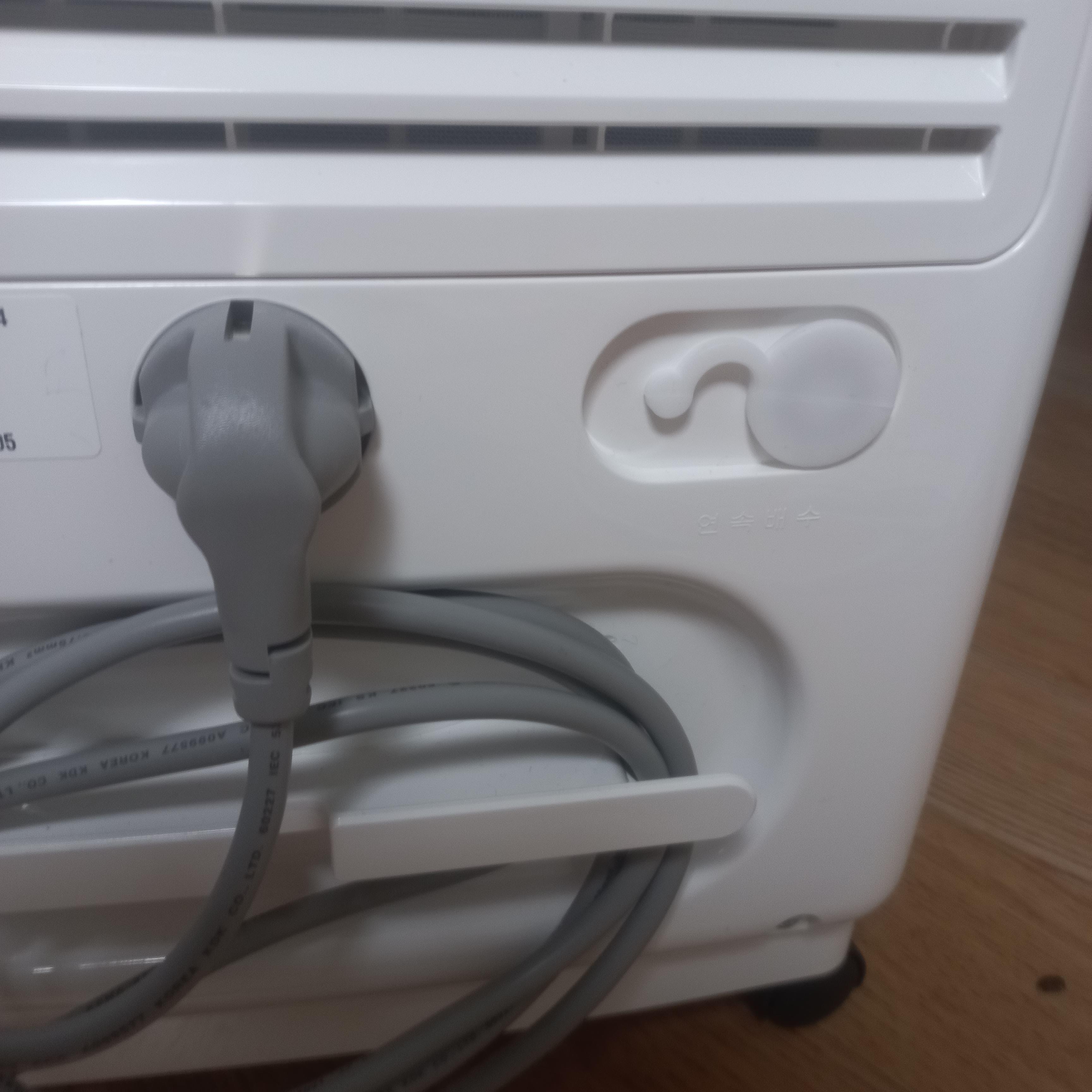 뒤쪽을 보면, 흡입구가 있고, 그 밑으로 사용하지 않을 때 전원줄을 정리할 수 있는 장치가 되어 있습니다. 혹시 규격이 맞는 호스가 있다면 물통을 사용하지 않고 오른쪽 구멍을 통해 바로 물을 배출할 수 있습니다.