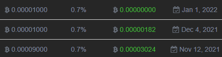 1000사토시를 재투자했습니다. 이번에 투자한 금액은 22년 1월 1일까지 하루에 7사토시씩 이자가 나오네요.